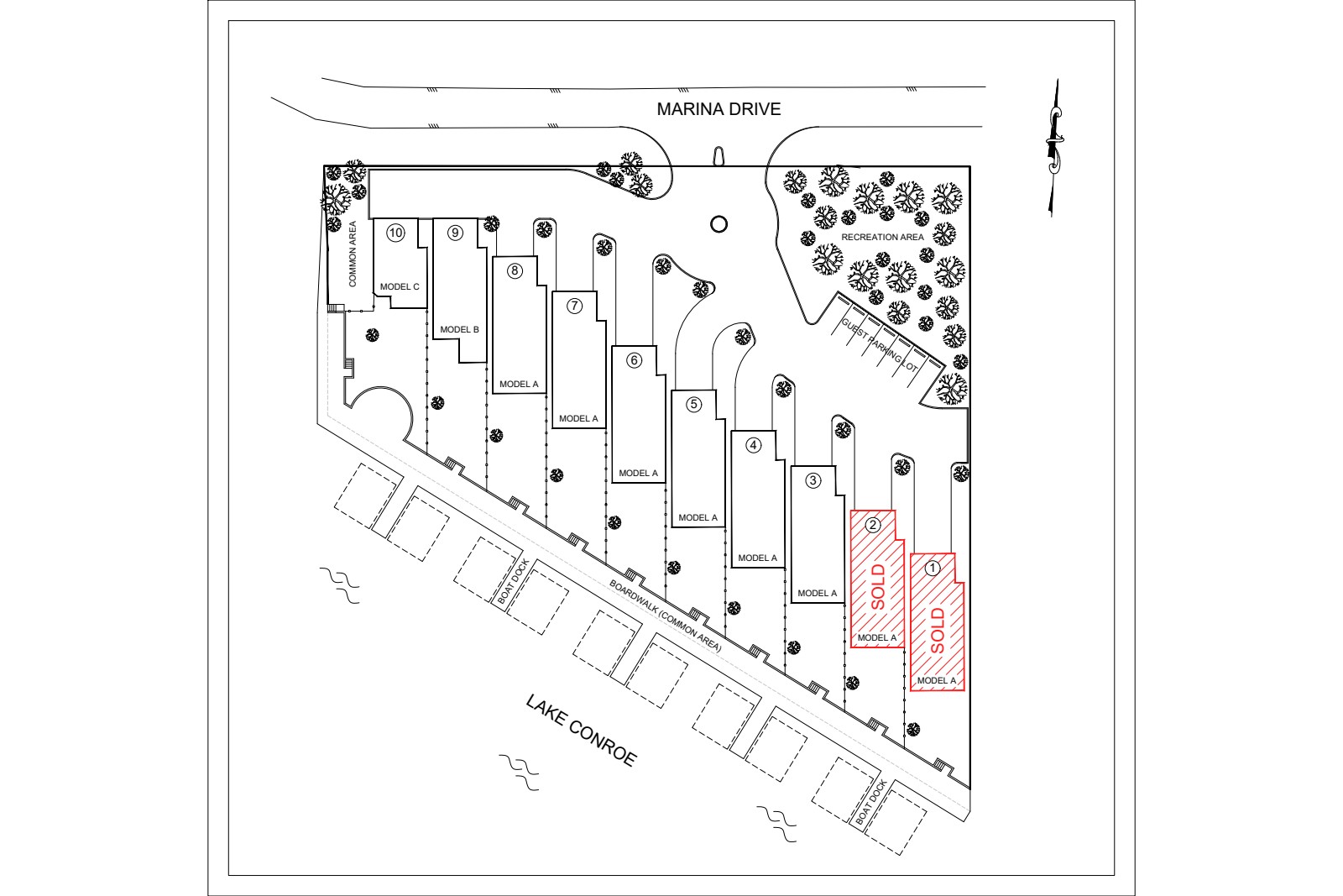 Explore the layout of Golden Coast Estates luxury lakefront townhomes at 15303 Marina Dr, Montgomery, TX. Discover 8 available waterfront units with private boat docks and boardwalk access along Lake Conroe.
